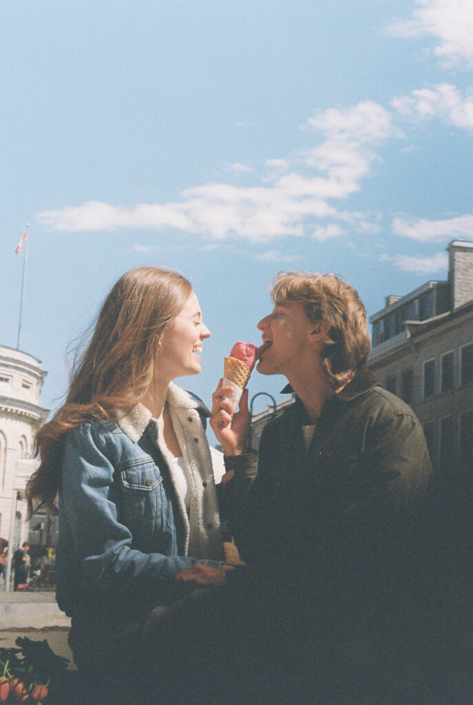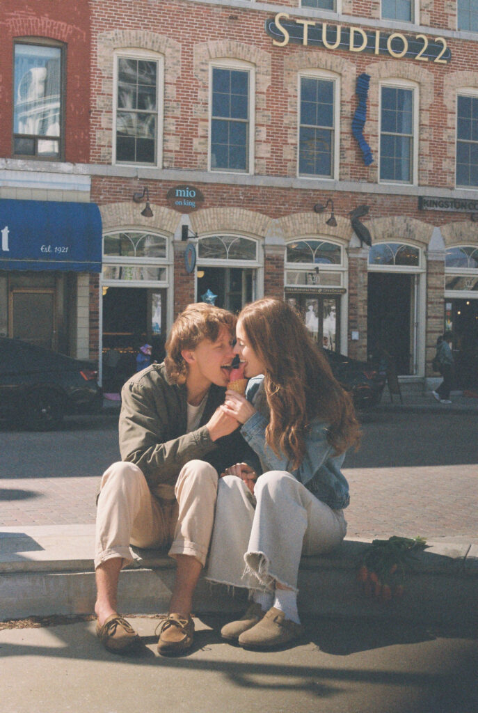 Couple sit on fountain edge with tulips and ice cream. Kingston, ON engagement photoshoot