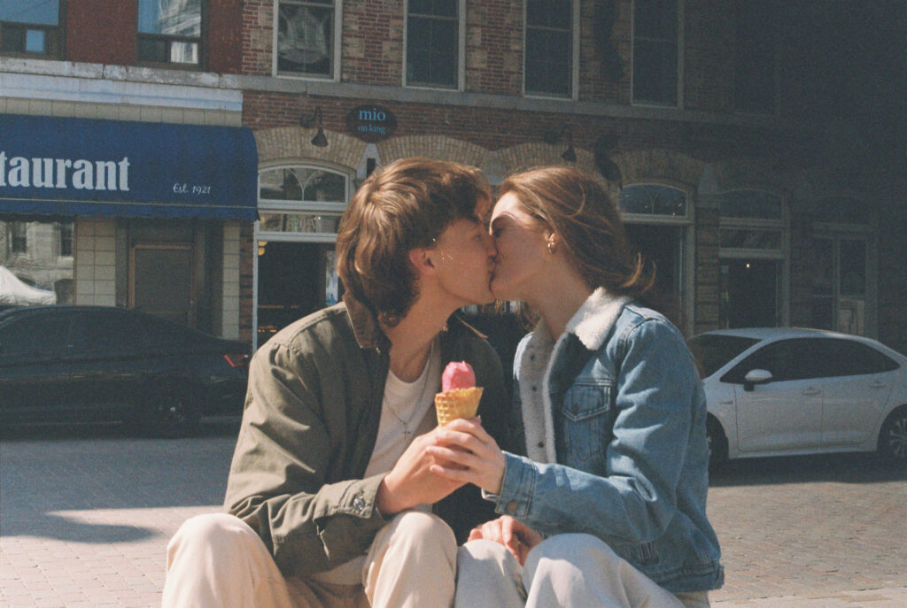 Couple kisses while holding ice cream   cone.