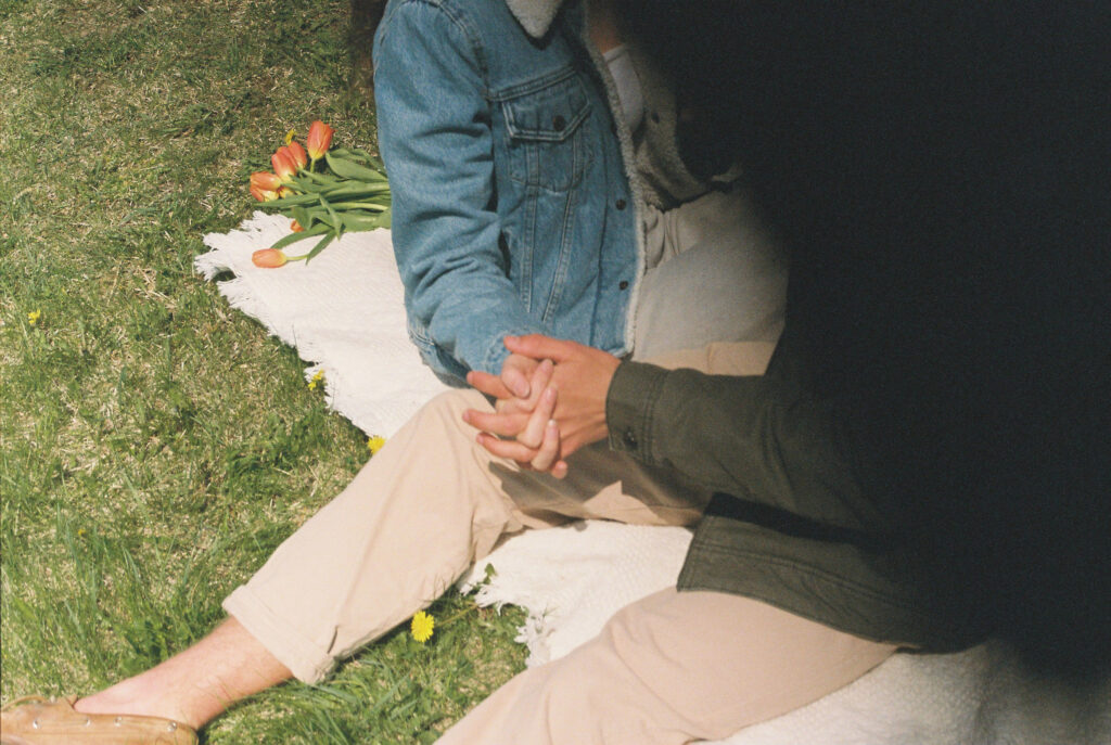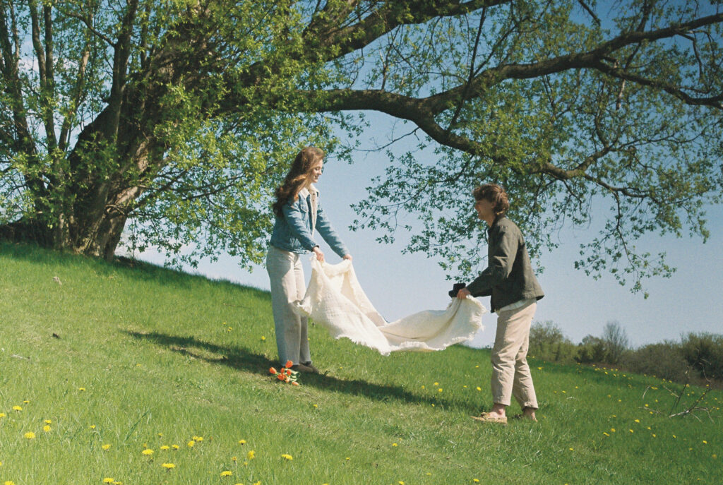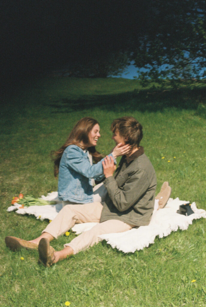 Couple sits on white blanket outside on a grass landscape.